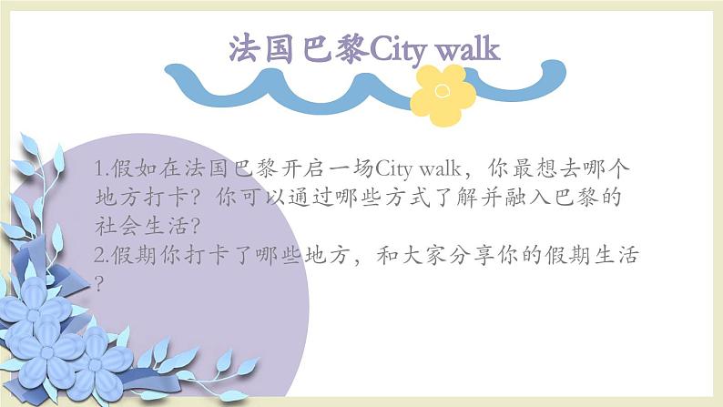 1.假如在法国巴黎开启一场City walk,你最想去哪个地方打卡?你可以通过哪些方式了解并融入巴黎的社会生活?2.假期你打卡了哪些地方,和大家分享你的假期生活?