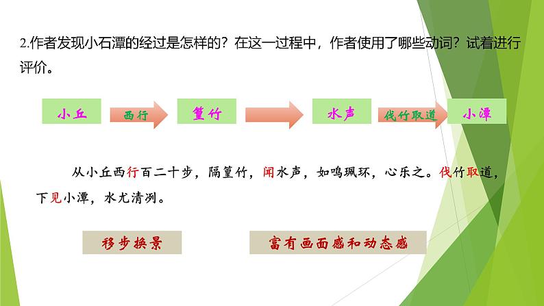 2.作者发现小石潭的经过是怎样的?在这一过程中,作者使用了哪些动词?试着进行评价。