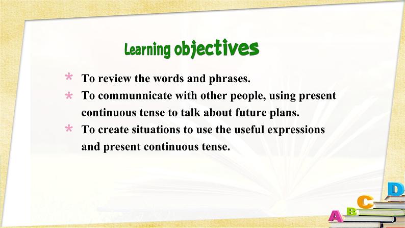 T review the wrds and phrases.T cmmunnicate with ther peple, using present cntinuus tense t talk abut future plans.T create situatins t use the useful expressins and present cntinuus tense.