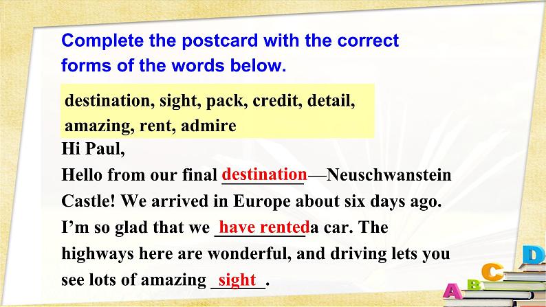 Hi Paul,Hell frm ur final _________ —Neuschwanstein Castle! We arrived in Eurpe abut six days ag. I’m s glad that we __________ a car. The highways here are wnderful, and driving lets yu see lts f amazing ______.