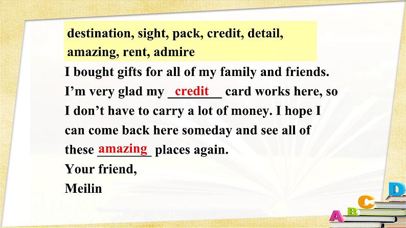I bught gifts fr all f my family and friends. I’m very glad my ________ card wrks here, s I dn’t have t carry a lt f mney. I hpe I can cme back here smeday and see all f these ________ places again.Yur friend,Meilin