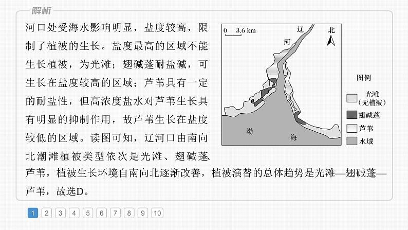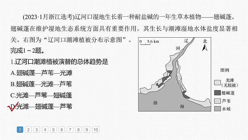 (2023·1月浙江选考)辽河口湿地生长着一种耐盐碱的一年生草本植物——翅碱蓬。翅碱蓬在维护湿地生态系统方面具有重要作用,其生长与潮滩湿地水体盐度显著相关。右图为“辽河口潮滩植被分布示意图”。完成1~2题。1.辽河口潮滩植被演替的总体趋势是A.翅碱蓬—芦苇—光滩B.翅碱蓬—光滩—芦苇C.光滩—芦苇—翅碱蓬D.光滩—翅碱蓬—芦苇