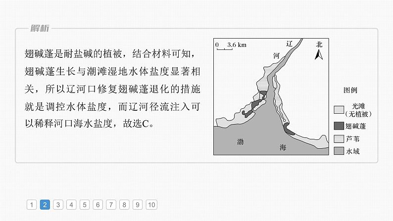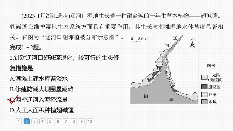 (2023·1月浙江选考)辽河口湿地生长着一种耐盐碱的一年生草本植物——翅碱蓬。翅碱蓬在维护湿地生态系统方面具有重要作用,其生长与潮滩湿地水体盐度显著相关。右图为“辽河口潮滩植被分布示意图”。完成1~2题。2.针对辽河口翅碱蓬退化,较可行的生态修复措施是A.潮滩上建水库蓄淡水B.修建防潮大坝围垦潮滩C.调控辽河入海径流量D.人工大面积种植翅碱蓬