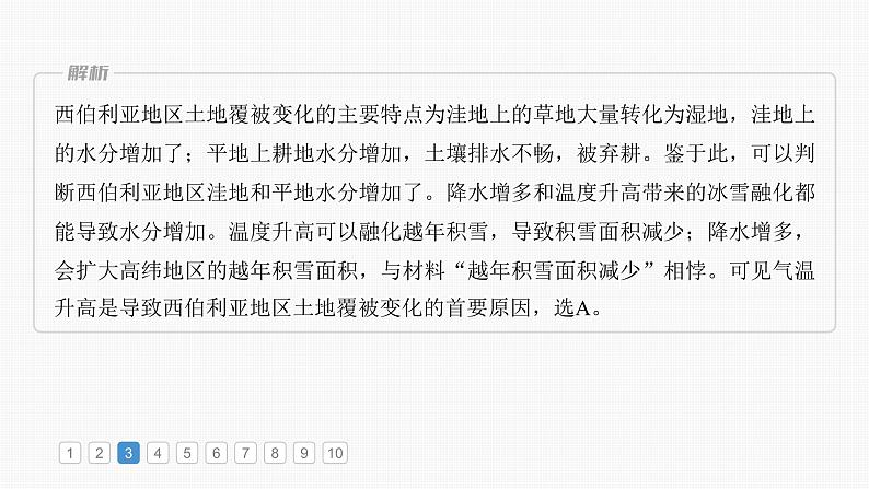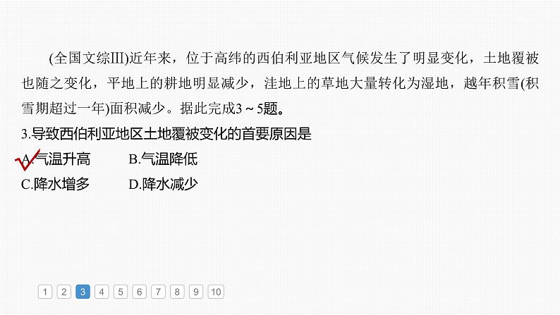 (全国文综Ⅲ)近年来,位于高纬的西伯利亚地区气候发生了明显变化,土地覆被也随之变化,平地上的耕地明显减少,洼地上的草地大量转化为湿地,越年积雪(积雪期超过一年)面积减少。据此完成3~5题。3.导致西伯利亚地区土地覆被变化的首要原因是A.气温升高 B.气温降低C.降水增多 D.降水减少