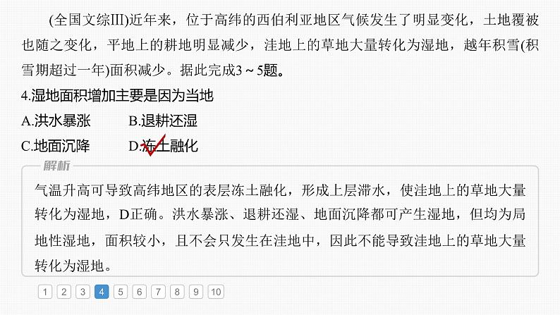 (全国文综Ⅲ)近年来,位于高纬的西伯利亚地区气候发生了明显变化,土地覆被也随之变化,平地上的耕地明显减少,洼地上的草地大量转化为湿地,越年积雪(积雪期超过一年)面积减少。据此完成3~5题。4.湿地面积增加主要是因为当地A.洪水暴涨 B.退耕还湿C.地面沉降 D.冻土融化