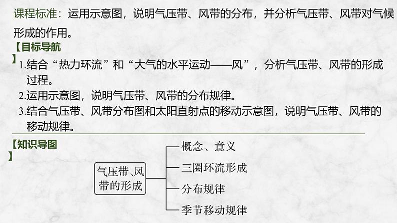 课程标准:运用示意图,说明气压带、风带的分布,并分析气压带、风带对气候形成的作用。