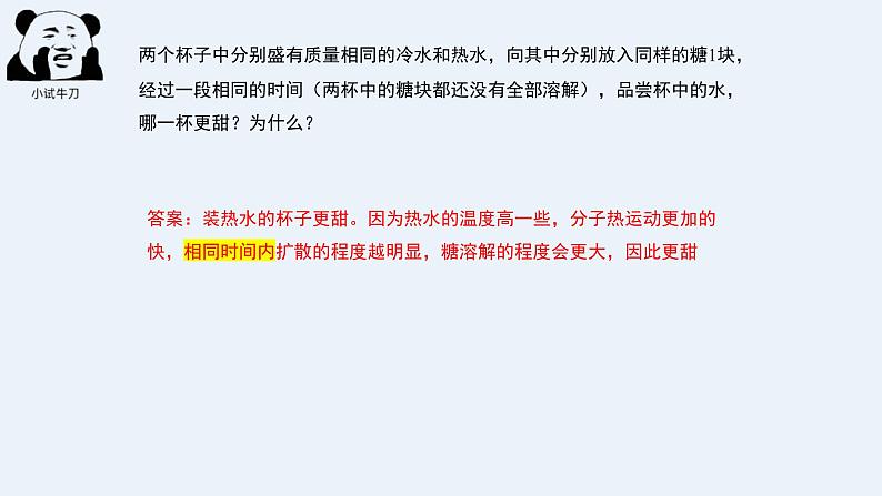 两个杯子中分别盛有质量相同的冷水和热水,向其中分别放入同样的糖1块,经过一段相同的时间(两杯中的糖块都还没有全部溶解),品尝杯中的水,哪一杯更甜?为什么?