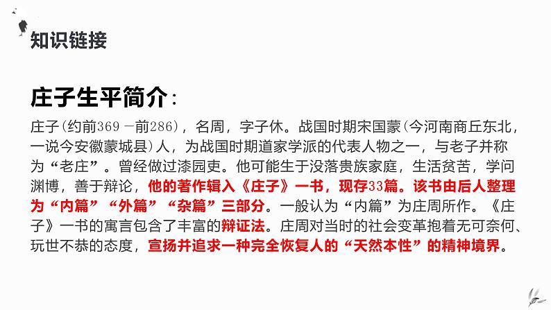 这是一份高中语文1.3 庖丁解牛课文配套ppt课件,共21页。PPT课件主要包含了学习目标,猜猜他是谁,庄子生平简介,知背景等内容,欢迎下载使用。