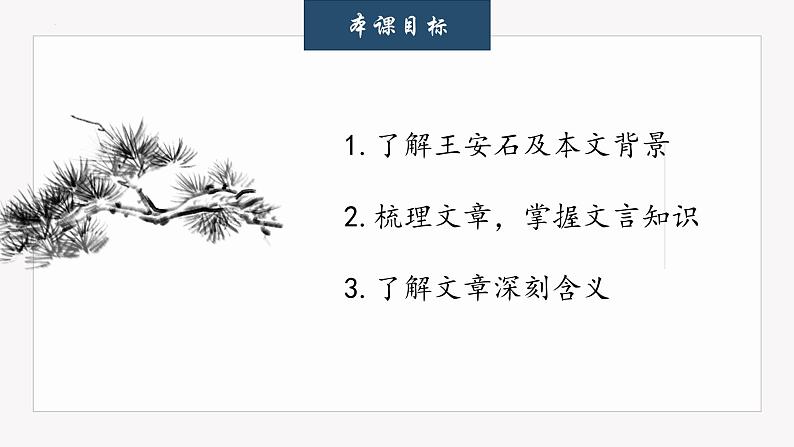 1.了解王安石及本文背景2.梳理文章,掌握文言知识3.了解文章深刻含义
