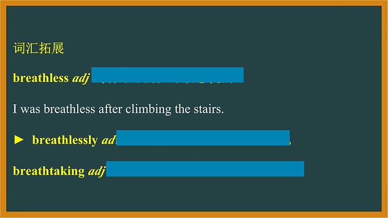 词汇拓展breathless adj 气喘吁吁的;呼吸急促的:I was breathless after climbing the stairs. ► breathlessly adv 上气不接下气地;气喘吁吁地breathtaking adj 激动人心的;惊人的;令人惊叹的