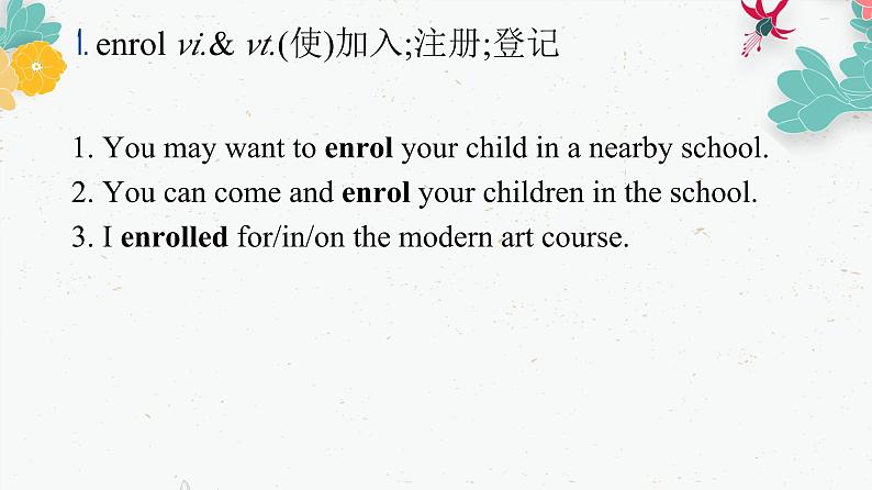 1. Yu may want t enrl yur child in a nearby schl.2. Yu can cme and enrl yur children in the schl.3. I enrlled fr/in/n the mdern art curse.
