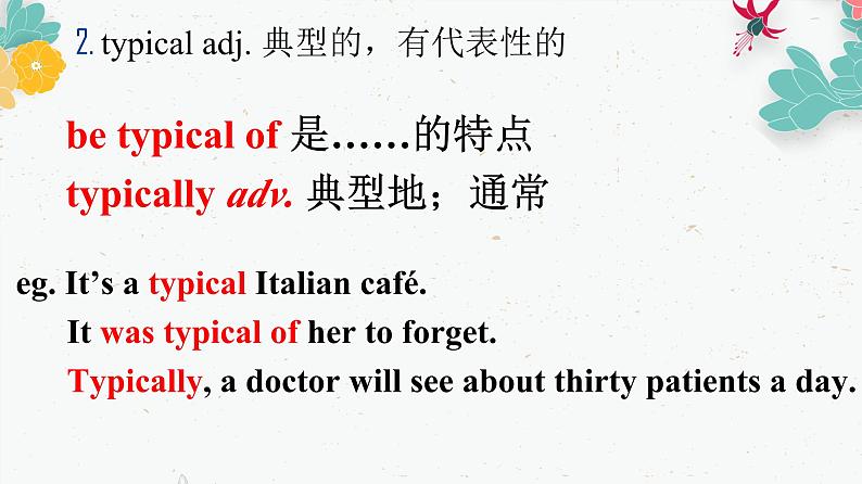 eg. It’s a typical Italian café. It was typical f her t frget. Typically, a dctr will see abut thirty patients a day.