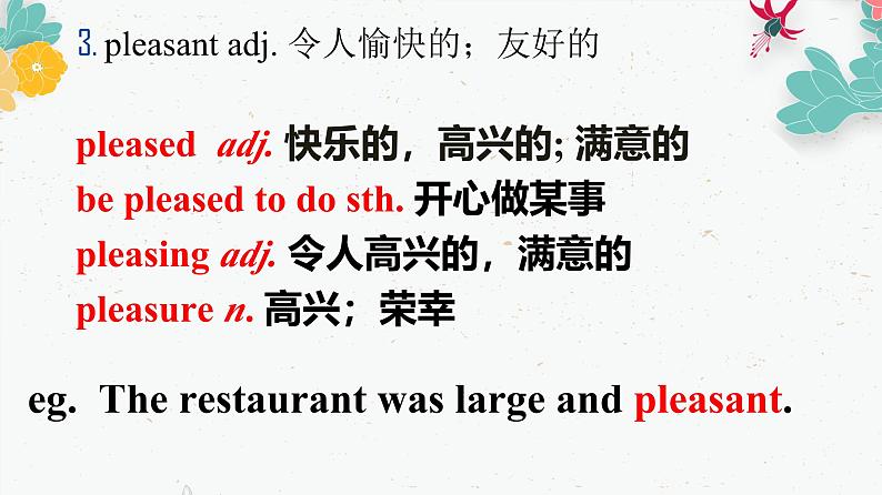 pleased adj. 快乐的,高兴的; 满意的be pleased t d sth. 开心做某事pleasing adj. 令人高兴的,满意的pleasure n. 高兴;荣幸