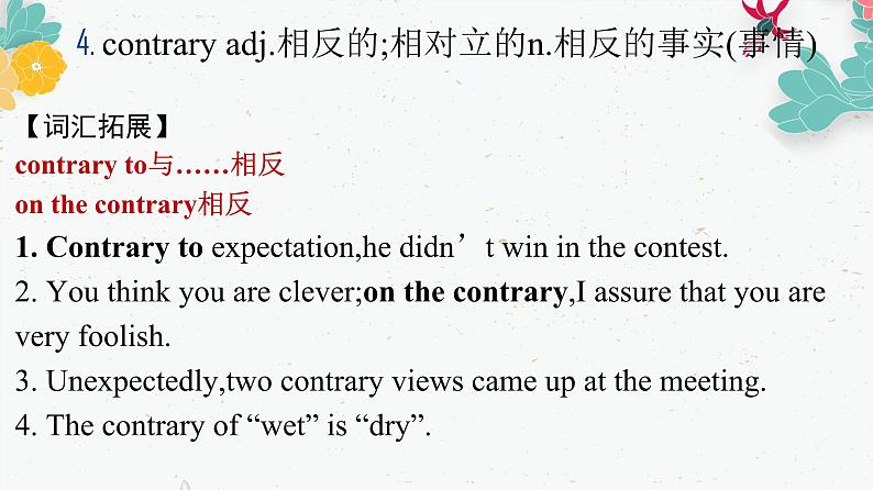 【词汇拓展】cntrary t与……相反n the cntrary相反1. Cntrary t expectatin,he didn’t win in the cntest.2. Yu think yu are clever;n the cntrary,I assure that yu are very flish. 3. Unexpectedly,tw cntrary views came up at the meeting.4. The cntrary f “wet” is “dry”.