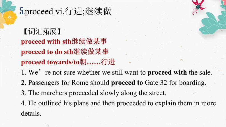 【词汇拓展】prceed with sth继续做某事prceed t d sth继续做某事prceed twards/t朝……行进1. We’re nt sure whether we still want t prceed with the sale.2. Passengers fr Rme shuld prceed t Gate 32 fr barding.3. The marchers prceeded slwly alng the street.4. He utlined his plans and then prceeded t explain them in mre details.