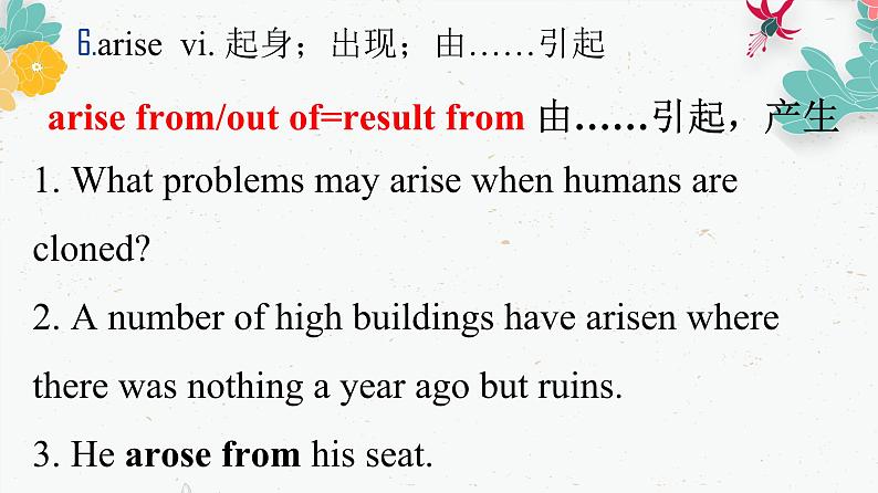 1. What prblems may arise when humans are clned? 2. A number f high buildings have arisen where there was nthing a year ag but ruins. 3. He arse frm his seat.4. Accidents ften arise frm / ut f carelessness.