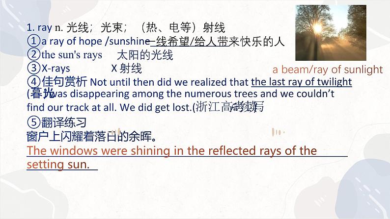 1. ray n. 光线;光束;(热、电等)射线①a ray f hpe /sunshine______________②the sun's rays 太阳的光线③X-rays X 射线④佳句赏析 Nt until then did we realized that the last ray f twilight(暮光) was disappearing amng the numerus trees and we culdn’t find ur track at all. We did get lst.(浙江高考读后续写)⑤翻译练习窗户上闪耀着落日的余晖。_____________________________________________________________________________