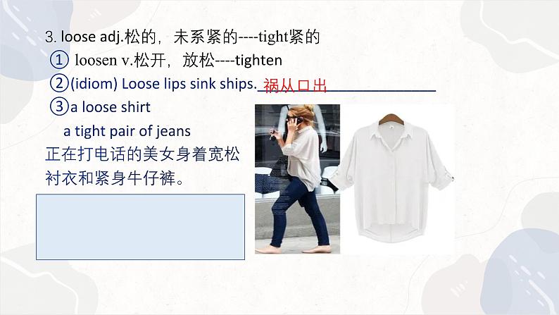 3. lse adj.松的,未系紧的----tight紧的 ① lsen v.松开,放松----tighten ②(idim) Lse lips sink ships.______________________ ③a lse shirt a tight pair f jeans正在打电话的美女身着宽松衬衣和紧身牛仔裤。The beauty n the phnewears a lse shirt and a tight pair f jeans.