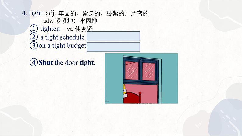4. tight adj. 牢固的;紧身的;绷紧的;严密的 adv. 紧紧地;牢固地 ① tighten vt. 使变紧 ② a tight schedule 紧凑的日程安排 ③n a tight budget 预算紧张 ④Shut the dr tight.