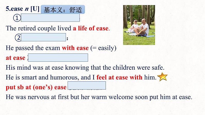 5.ease n [U] ① 舒适;悠闲;自在:The retired cuple lived a life f ease. ② 容易;不费力:He passed the exam with ease (= easily).at ease 放松;舒适;自在:His mind was at ease knwing that the children were safe. He is smart and humrus, and I feel at ease with him.put sb at (ne’s) ease 使某人放松:He was nervus at first but her warm welcme sn put him at ease.