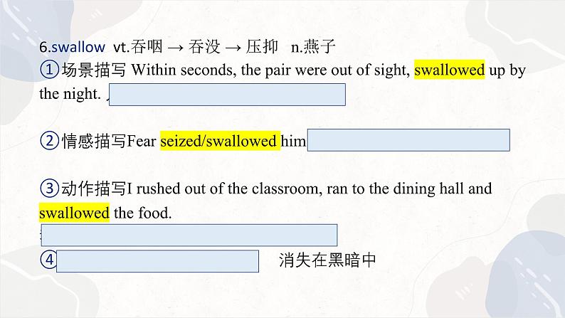 6.swallw vt.吞咽 → 吞没 → 压抑 n.燕子①场景描写 Within secnds, the pair were ut f sight, swallwed up by the night. 几秒钟后,他们俩消失在夜色中。②情感描写Fear seized/swallwed him.恐惧把他吞噬了。③动作描写I rushed ut f the classrm, ran t the dining hall and swallwed the fd. 我冲出教室跑向食堂狼吞虎咽地吃着饭。④be swallwed by the darkness 消失在黑暗中