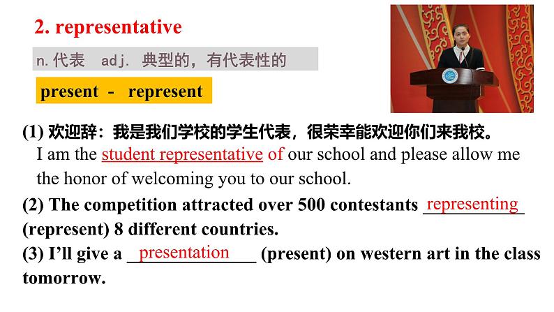 (1) 欢迎辞:我是我们学校的学生代表,很荣幸能欢迎你们来我校。(2) The cmpetitin attracted ver 500 cntestants ___________ (represent) 8 different cuntries.(3) I’ll give a ______________ (present) n western art in the class tmrrw.