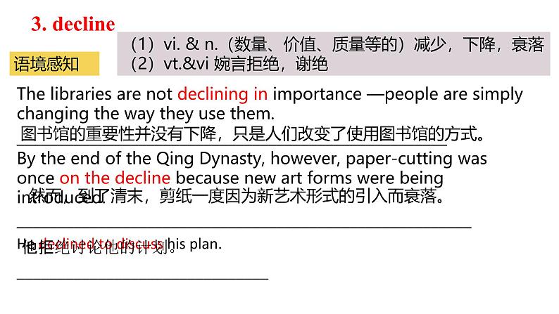 (1)vi. & n.(数量、价值、质量等的)减少,下降,衰落(2)vt.&vi 婉言拒绝,谢绝