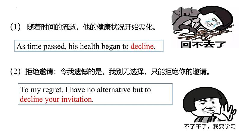 (1) 随着时间的流逝,他的健康状况开始恶化。(2)拒绝邀请:令我遗憾的是,我别无选择,只能拒绝你的邀请。