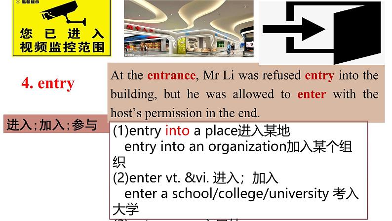 (1)entry int a place进入某地 entry int an rganizatin加入某个组织(2)enter vt. &vi. 进入;加入 enter a schl/cllege/university 考入大学(3)entrance n. 入口处 entrance t a place 某地的入口处
