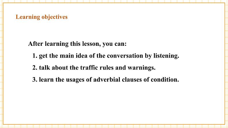 1. New wrds: Useful expressins: be in danger, cause truble, get a fine, get hurt, break the traffic rules3. “if” clauses: If we break the traffic rules, we may get a fine and even be in danger
