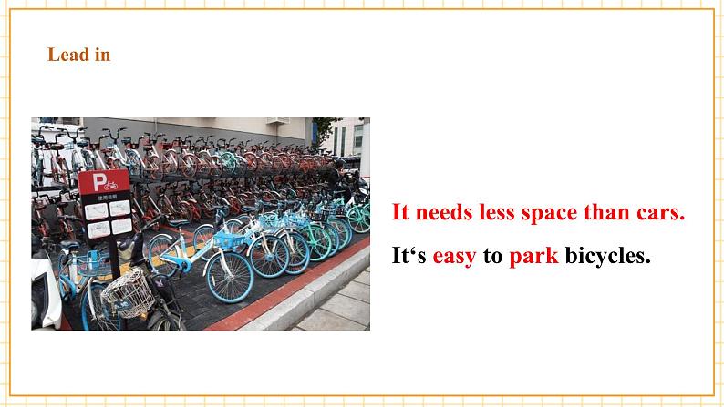 It needs less space than cars.It‘s easy t park bicycles.