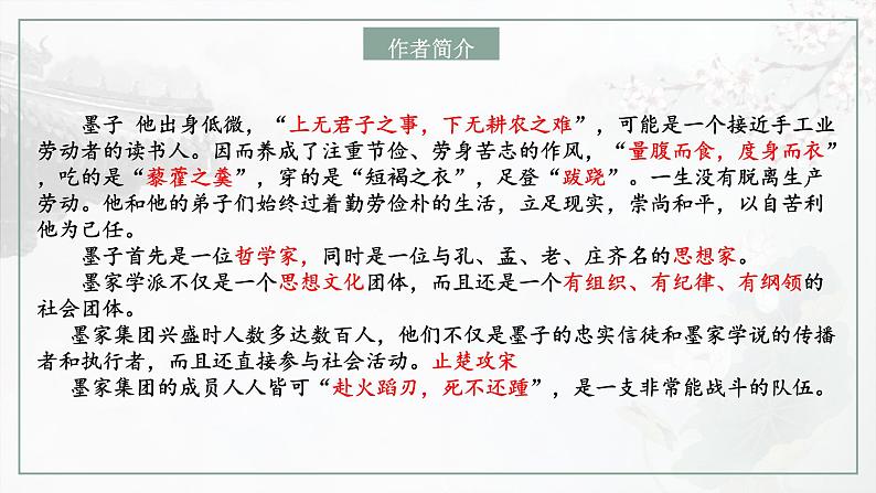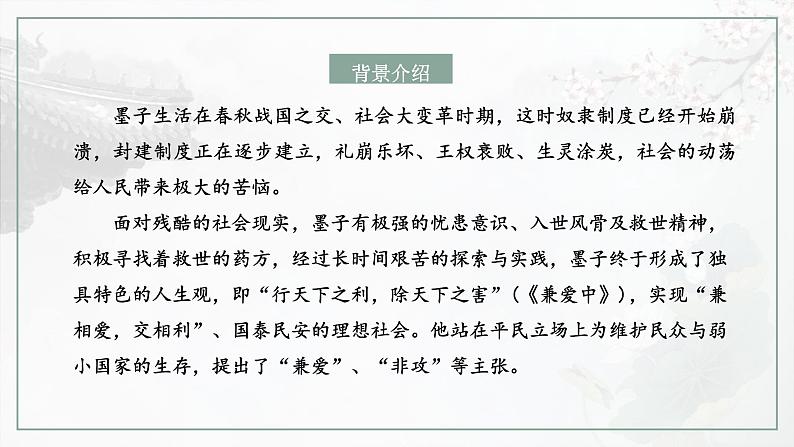 这是一份语文选择性必修 上册7 兼爱教课内容课件ppt,共26页。PPT课件主要包含了墨子思想,背景扫描,论证思路等内容,欢迎下载使用。