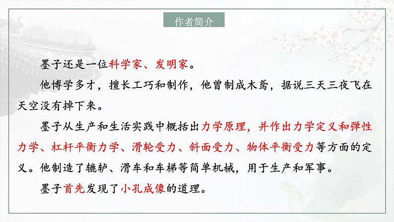 墨子还是一位科学家、发明家。 他博学多才,擅长工巧和制作,他曾制成木鸢,据说三天三夜飞在天空没有掉下来。 墨子从生产和生活实践中概括出力学原理,并作出力学定义和弹性力学、杠杆平衡力学、滑轮受力、斜面受力、物体平衡受力等方面的定义。他制造了辘轳、滑车和车梯等简单机械,用于生产和军事。 墨子首先发现了小孔成像的道理。