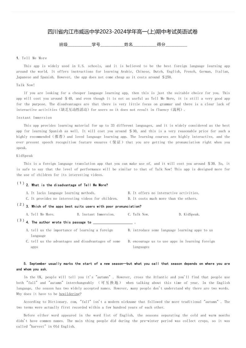 四川省内江市威远中学2023-2024学年高一(上)期中考试英语试卷(含解析)