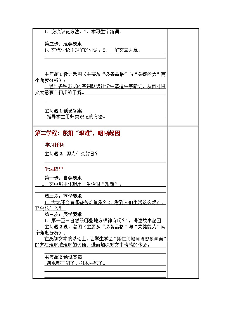 1、认读词语。2、通过上节课的学习,我们知道了这个故事是按“羿为什么射日?怎么射日?最后结果是什么?”三个部分讲述的,这节课我们继续按这个顺序继续学习这个故事。