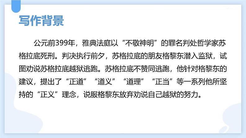 公元前399年,雅典法庭以“不敬神明”的罪名判处哲学家苏格拉底死刑。判决执行前夕,苏格拉底的朋友格黎东潜入监狱,试图劝说苏格拉底越狱逃跑。苏格拉底不赞同逃跑,他针对格黎东的建议,提出了“正道”“道义”“道理”“正当”等一系列他所坚持的“正义”理念,说服格黎东放弃劝说自己越狱的努力。