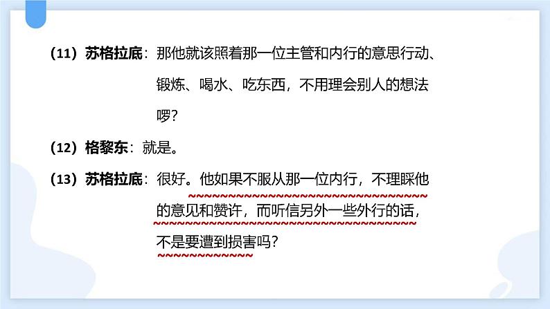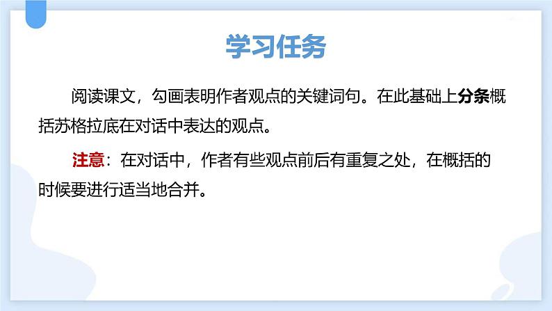 阅读课文,勾画表明作者观点的关键词句。在此基础上分条概括苏格拉底在对话中表达的观点。 注意:在对话中,作者有些观点前后有重复之处,在概括的时候要进行适当地合并。