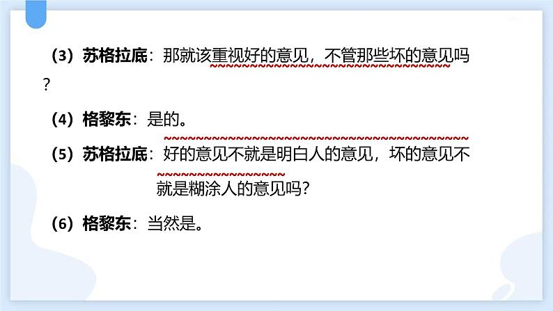 (3)苏格拉底:那就该重视好的意见,不管那些坏的意见吗?(4)格黎东:是的。(5)苏格拉底:好的意见不就是明白人的意见,坏的意见不 就是糊涂人的意见吗?(6)格黎东:当然是。