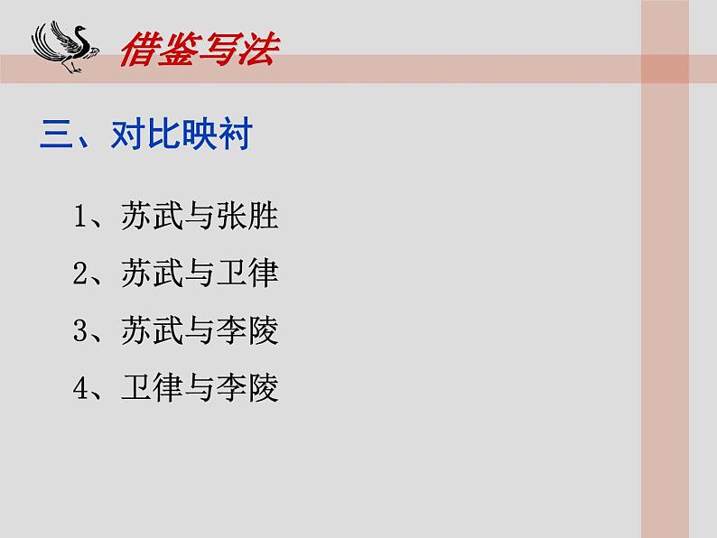 1、苏武与张胜2、苏武与卫律3、苏武与李陵4、卫律与李陵