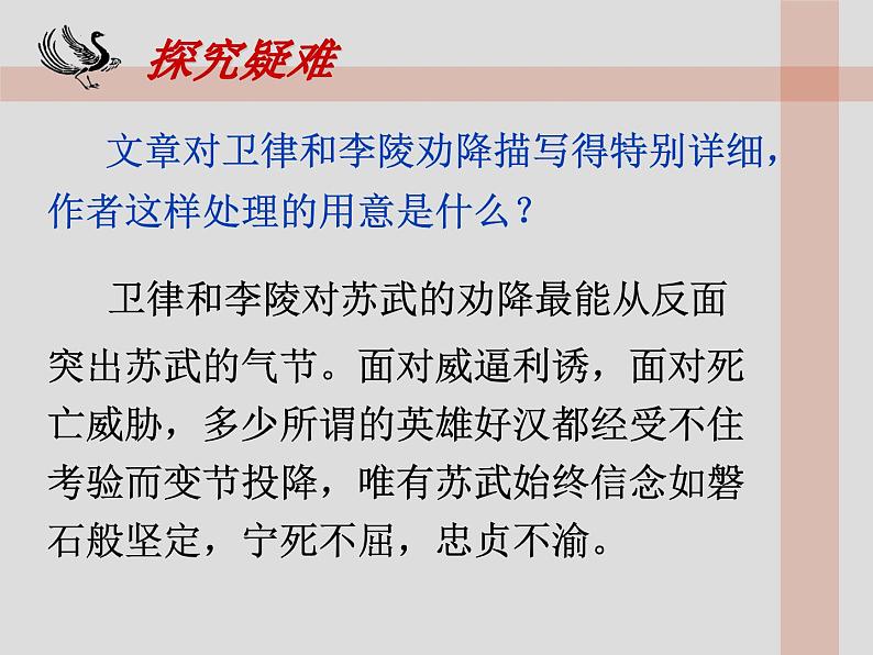面对卫律的威逼利诱,甚至是死亡的威胁,苏武不但无所畏惧,还义正词严地指责卫律的卖国行径。面对李陵的真挚劝说,苏武也会因亲人惨死、妻离子散而倍感痛苦,但为国效命的信念终于战胜了一切。他忠君爱国,至死不渝,他是铁骨铮铮的硬汉,他是坚贞不二的君子。