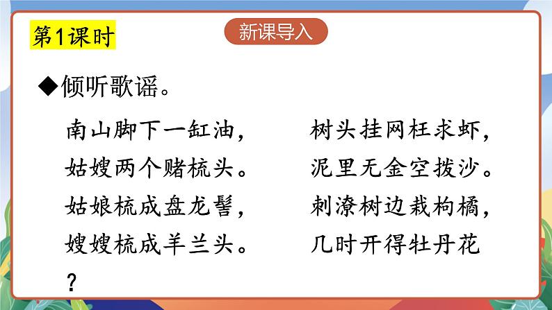 展开南山脚下一缸油, 树头挂网枉求虾,姑嫂两个赌梳头。 泥里无金空拨沙。姑娘梳成盘龙髻, 刺潦树边栽枸橘,嫂嫂梳成羊兰头。 几时开得牡丹花?