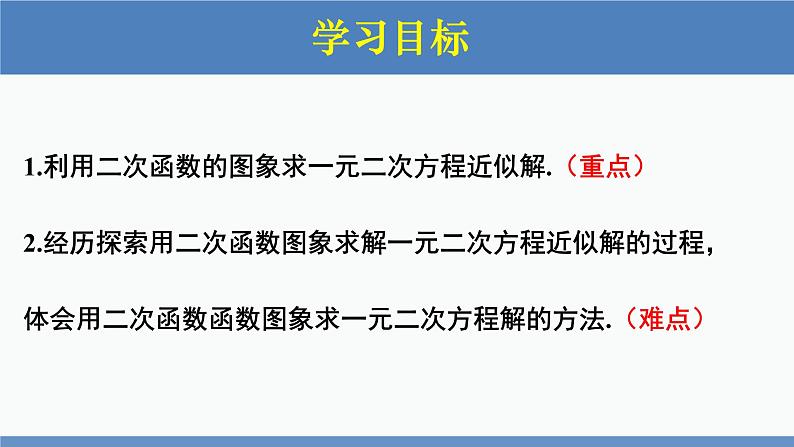 1.利用二次函数的图象求一元二次方程近似解.(重点)2.经历探索用二次函数图象求解一元二次方程近似解的过程,体会用二次函数函数图象求一元二次方程解的方法.(难点)