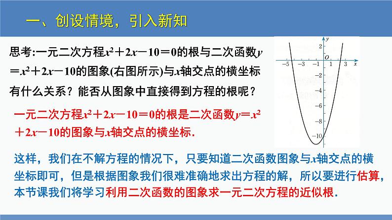 这样,我们在不解方程的情况下,只要知道二次函数图象与x轴交点的横坐标即可,但是根据图象我们很难准确地求出方程的解,所以要进行估算,本节课我们将学习利用二次函数的图象求一元二次方程的近似根.