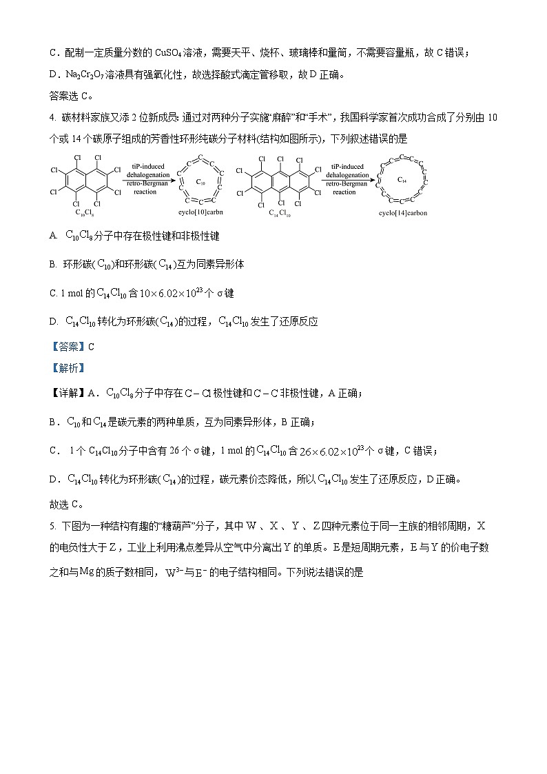 4. 碳材料家族又添2位新成员:通过对两种分子实施“麻醉”和“手术”,我国科学家首次成功合成了分别由10个或14个碳原子组成的芳香性环形纯碳分子材料(结构如图所示),下列叙述错误的是