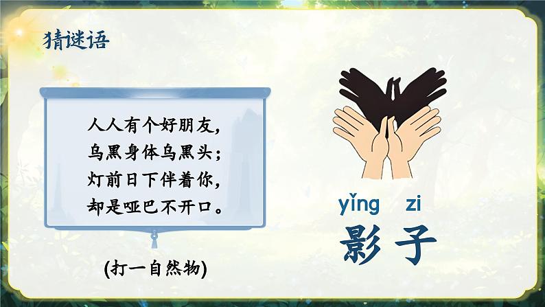 文化自信:体会“我”对影子的喜爱之情。语言运用:认识“影、前”等11个生字和宝盖、女字旁、月字旁3个偏旁;会写“在、好”等5个字和斜钩1个笔画。思维能力:正确朗读课文,体会“我”对影子的喜爱之情。借助生活经验,理解在阳光下影子与人形影不离的特点。借助情境,辨别前、后、左、右4个方位,并用这4个词来表达方位。审美创造:在学习、游戏过程中,学会与小伙伴一起合作学习、友好相处。