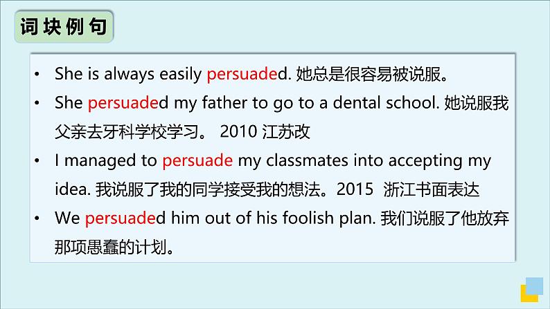 She is always easily persuaded. 她总是很容易被说服。She persuaded my father t g t a dental schl. 她说服我父亲去牙科学校学习。 2010 江苏改I managed t persuade my classmates int accepting my idea. 我说服了我的同学接受我的想法。2015 浙江书面表达We persuaded him ut f his flish plan. 我们说服了他放弃那项愚蠢的计划。