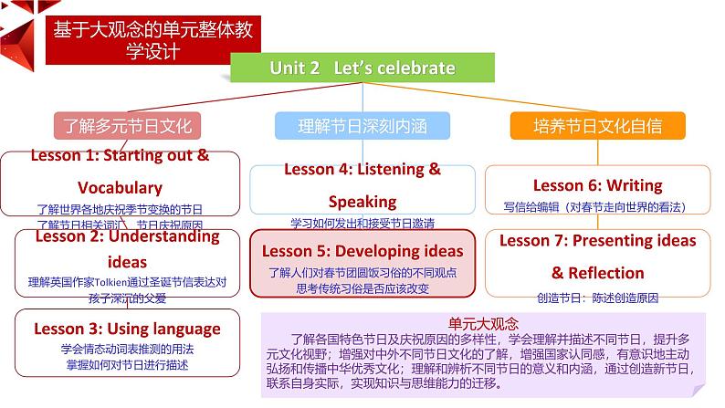 单元大观念 了解各国特色节日及庆祝原因的多样性,学会理解并描述不同节日,提升多元文化视野;增强对中外不同节日文化的了解,增强国家认同感,有意识地主动弘扬和传播中华优秀文化;理解和辨析不同节日的意义和内涵,通过创造新节日,联系自身实际,实现知识与思维能力的迁移。