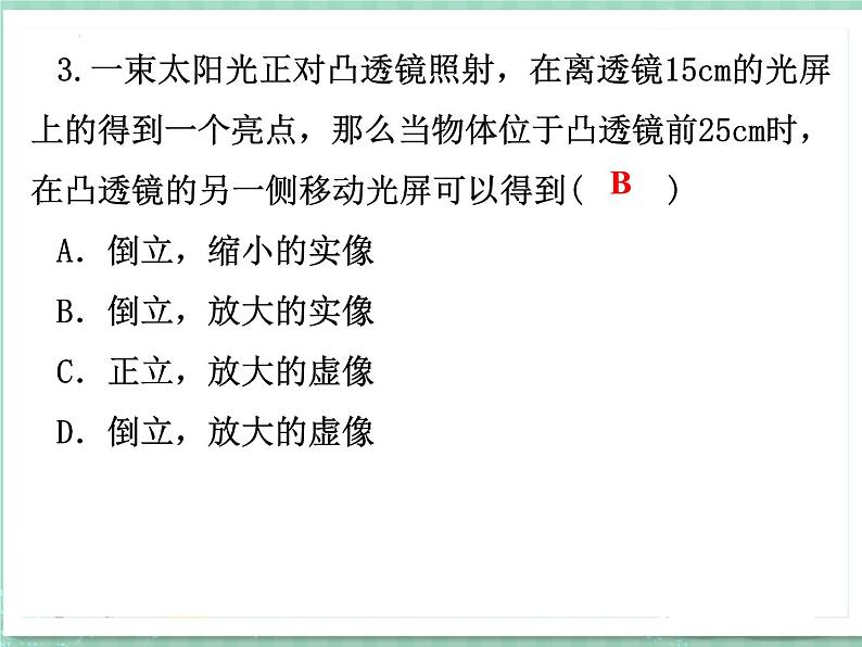 3.一束太阳光正对凸透镜照射,在离透镜15cm的光屏上的得到一个亮点,那么当物体位于凸透镜前25cm时,在凸透镜的另一侧移动光屏可以得到( )A.倒立,缩小的实像B.倒立,放大的实像C.正立,放大的虚像D.倒立,放大的虚像