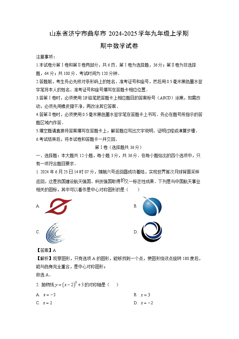 2024-2025学年山东省济宁市曲阜市九年级(上)期中 数学试卷(解析版)