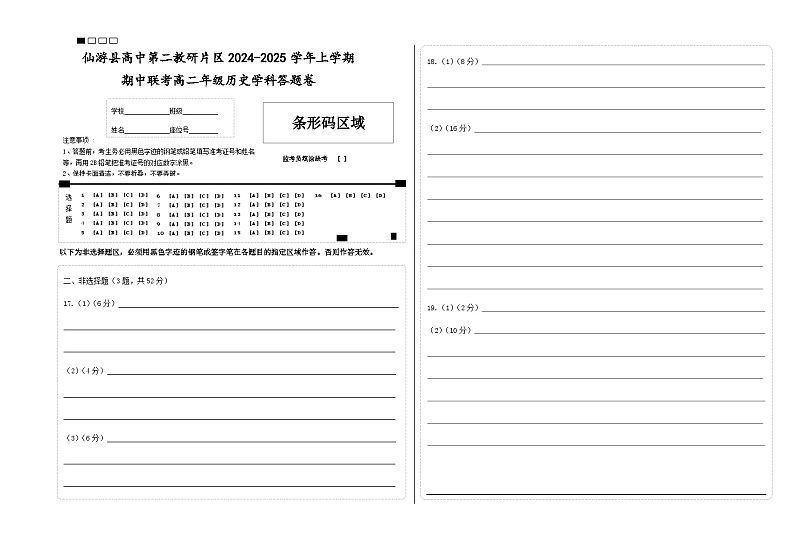 这是一份福建省莆田市仙游县第二教研片区2024-2025学年高二上学期期中考试历史试题,文件包含福建省莆田市仙游县第二教研片区2024-2025学年高二上学期期中考试历史试题docx、仙游县高中第二教研片区2024-2025学年上学期期中联考高二年级历史学科试卷答案pdf、期中联考高二年级历史学科答题卷docx、期中联考高二年级历史学科答题卷填涂版docx等4份试卷配套教学资源,其中试卷共20页, 欢迎下载使用。